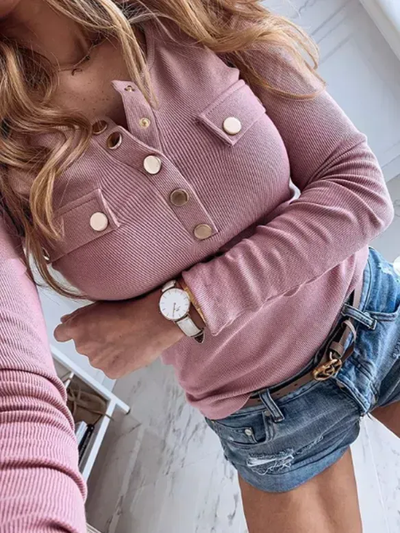 • Daily Pocket Button Pure Color Long Sleeve T-shirt