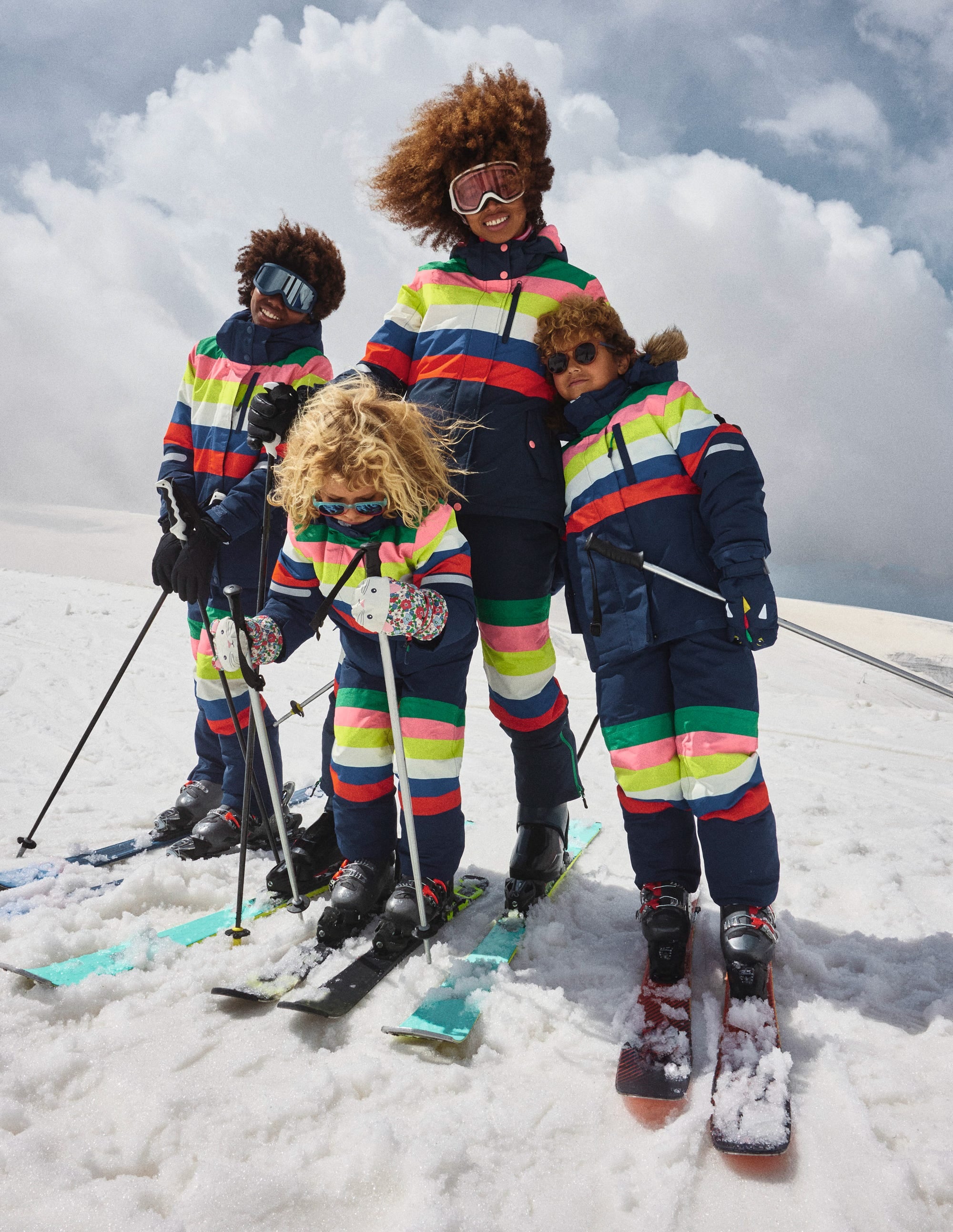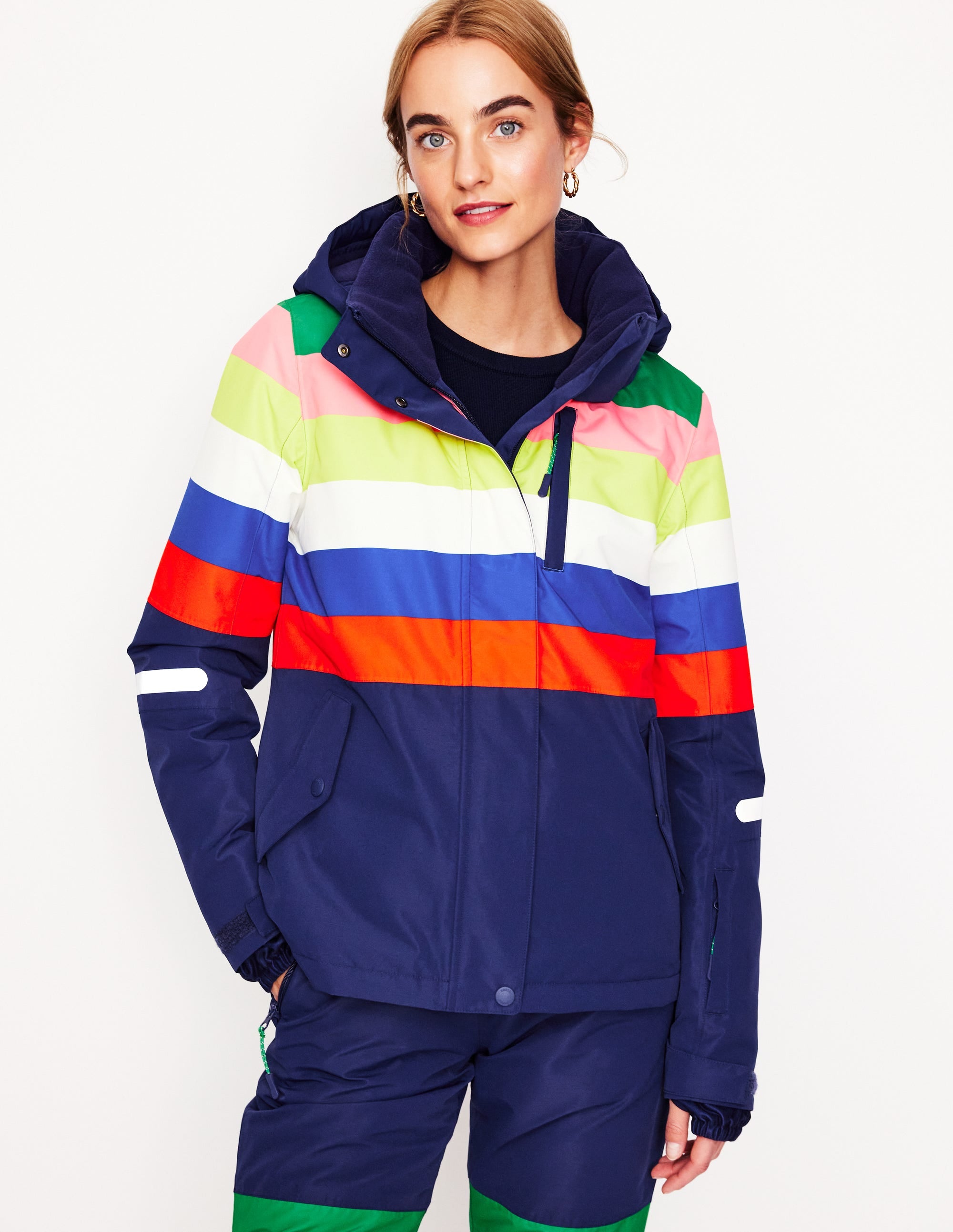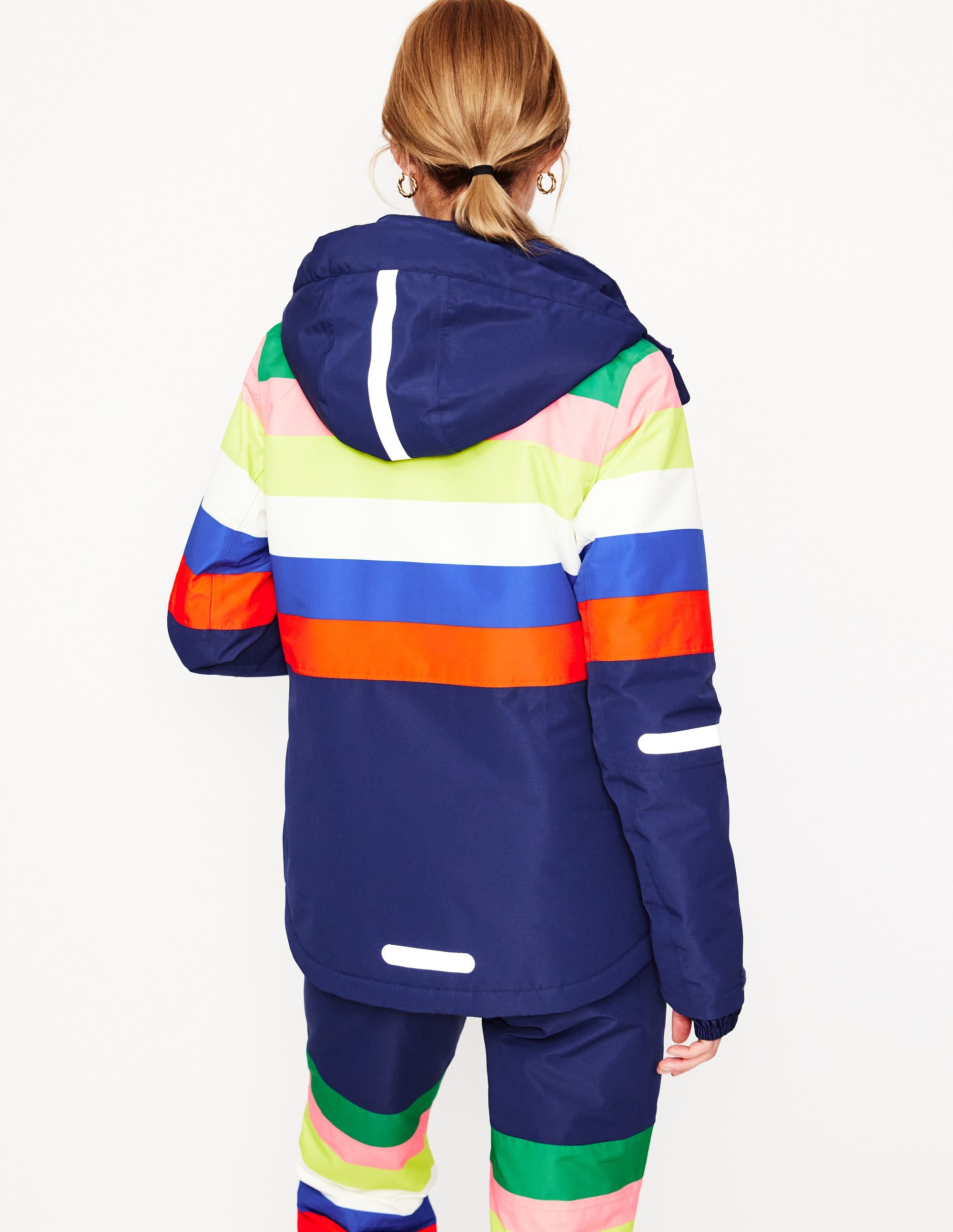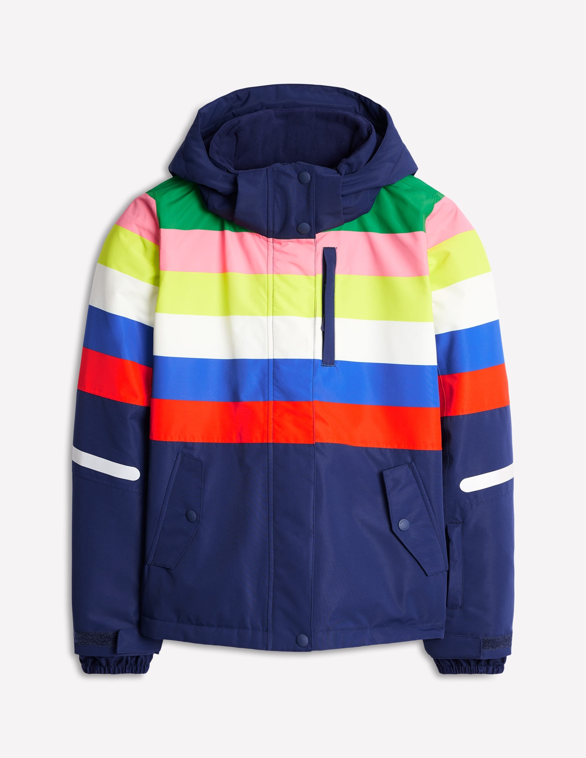 We'd be here all day if we listed every technical detail this ski jacket is designed with, but here are a few highlights: a ski pass pocket for less faffing at the gondola, a fleece-lined hood for extra cosiness, an internal snow skirt to keep you dry, and rainbow stripes for a signature Boden finish.
