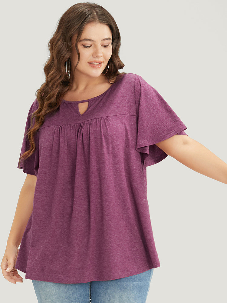 Plain Ruffle Sleeve Keyhole Gathered Crew Neck T-shirt