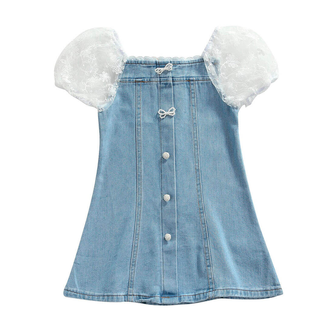 This toddler girl denim dress is a perfect combination of cute and stylish. The dress features a denim fabric that gives it a trendy and casual look, while the adorable lace sleeves add a touch of elegance and femininity to the outfit. The dress has a comfortable fit that allows little girls to move and play freely, and the lace detailing adds a delicate touch to the overall look.