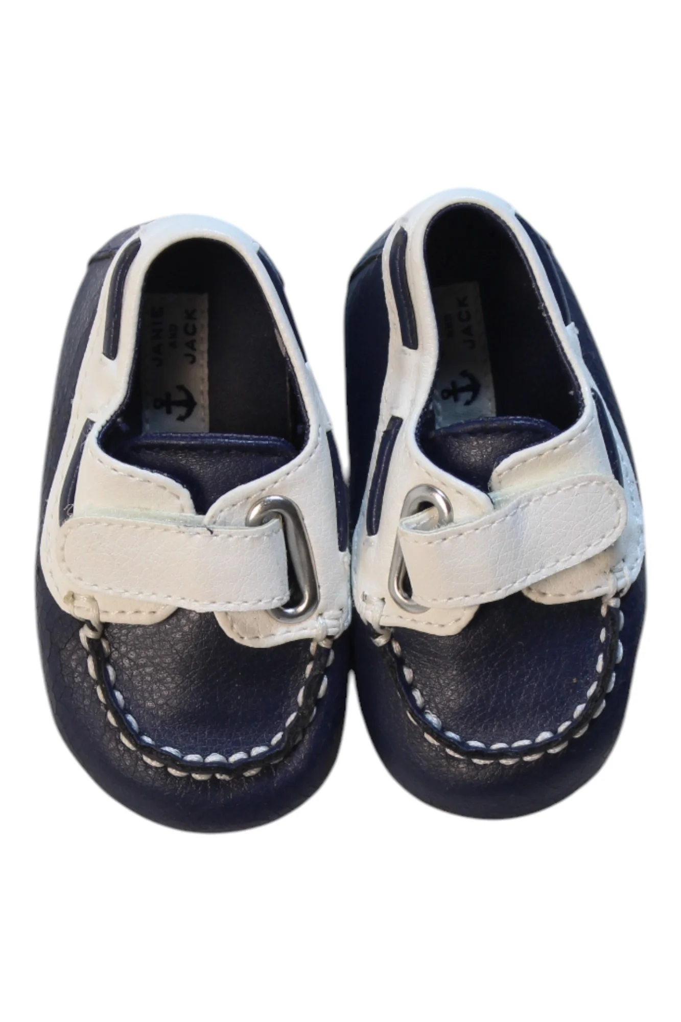 Make a stylish statement for your baby boy with these Janie & Jack Nautical Loafers, perfect for little ones aged 0-3 months. Crafted with a classic navy and white design, these preloved shoes not only add charm but also support sustainable fashion through circular consumption.