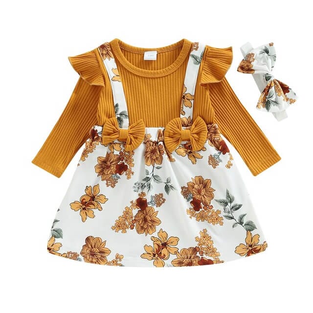 Elevate your toddler's style with this delightful long sleeve dress in a vibrant orange hue. The ribbed texture adds a touch of coziness, while the charming bows at the front infuse a playful element. The dress is adorned with cute and colorful flower prints, bringing a sense of joy and charm to her every movement. Whether she's exploring the world around her or attending a special event, this dress offers both comfort and style.