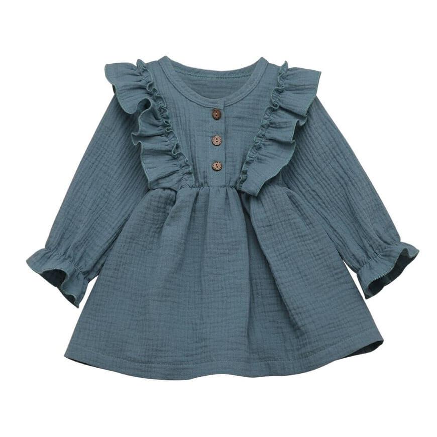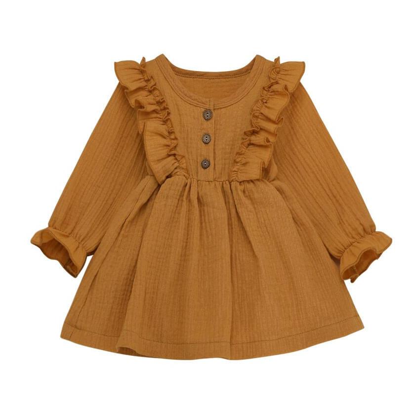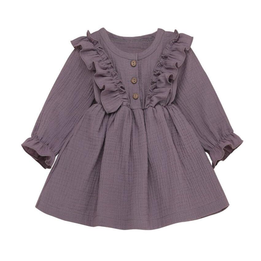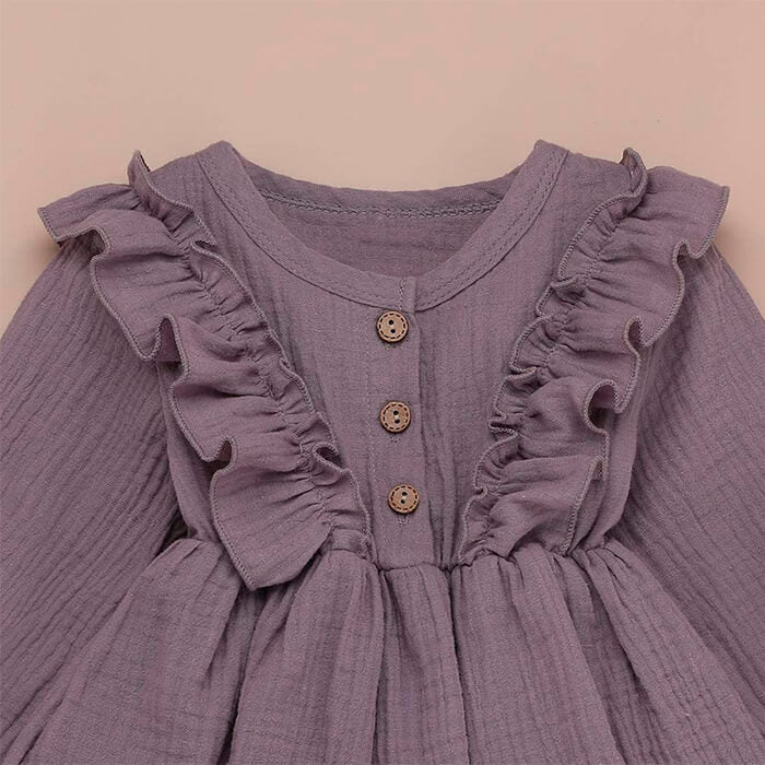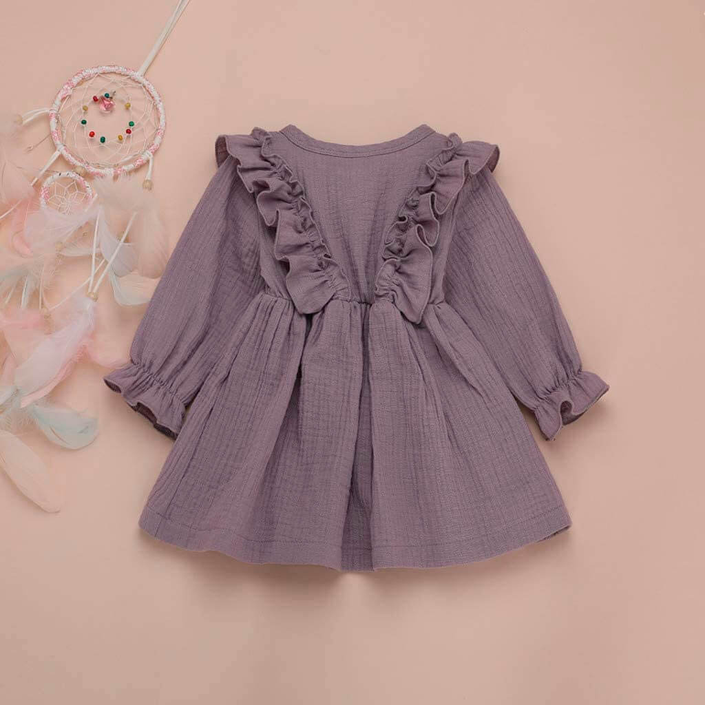 This toddler girl dress features long sleeves and is made of a soft, comfortable fabric. The dress has a solid color and is designed with a ruffled hemline, giving it a playful and girly look. It is perfect for cooler weather and can be easily paired with leggings or tights for added warmth. The dress is available in a variety of colors, making it easy to find the perfect one to suit your little girl's style.