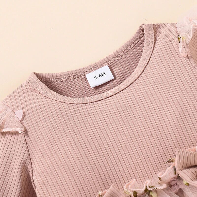 The delicate pink hue harmonizes with the whimsical floral pattern, creating a captivating blend of sweetness and grace. Adorned with charming ribbed bows at the front, this dress is a true testament to playful elegance. The tulle fabric adds a touch of lightness and movement, perfect for her every twirl and spin. Whether she's attending a special occasion or embracing everyday adventures, this dress effortlessly combines comfort and beauty.