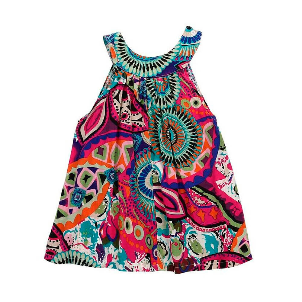 This sleeveless toddler girl dress with boho prints is perfect for summertime adventures! The light and airy fabric is comfortable for your little one, while the colorful boho print adds a fun and trendy touch. Perfect for pairing with sandals or boots, this dress is sure to become a staple in your little girl's wardrobe.